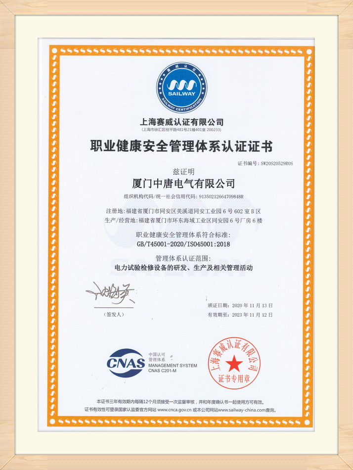 職業(yè)健康安全管理體系認(rèn)證證書(英文)